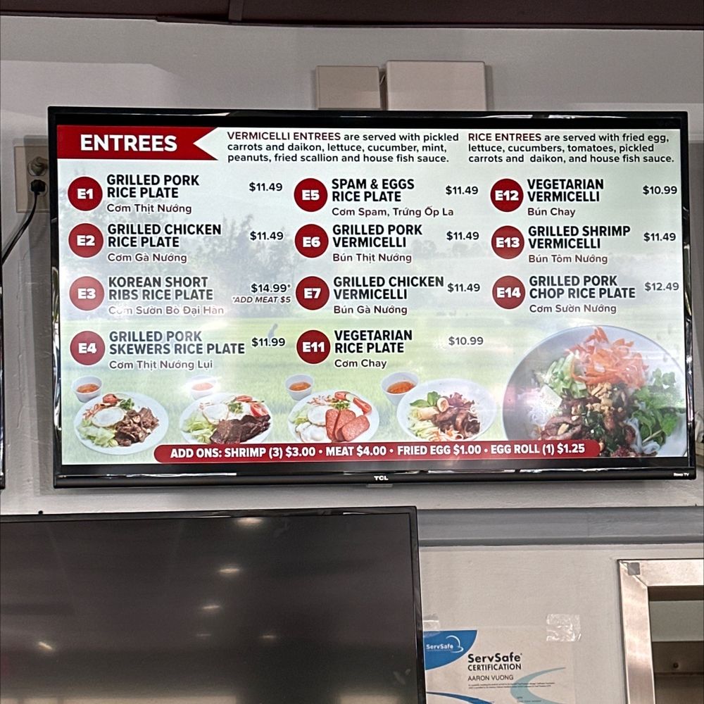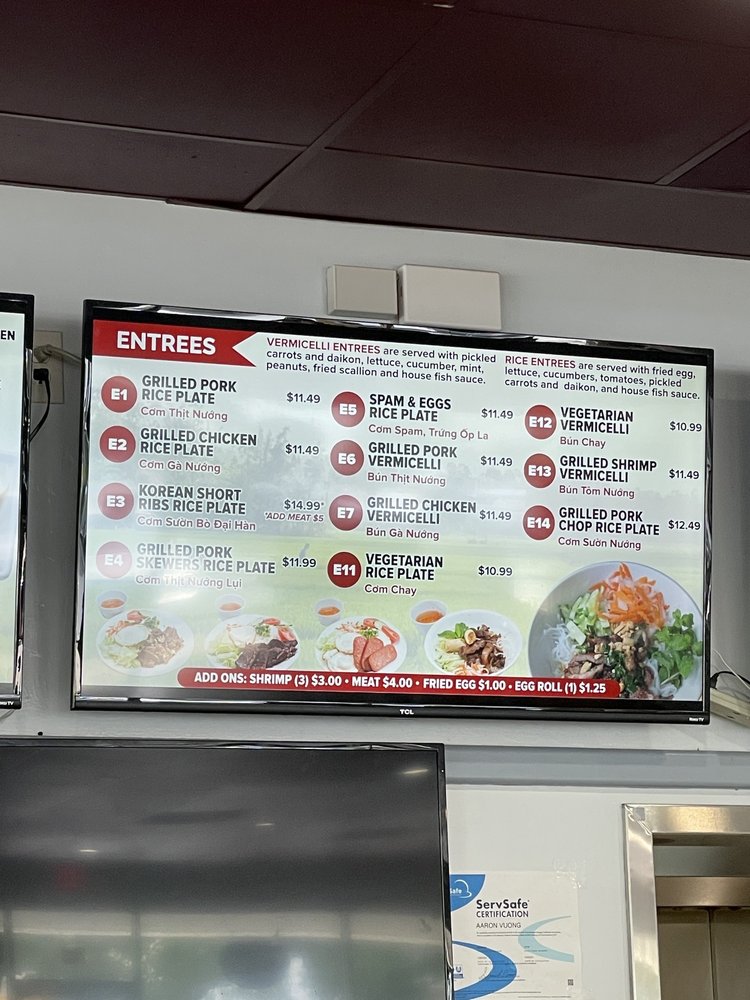 Com spam trứng ốp la. Rice entrées served with fried egg, lettuce, pickled carrots and daikon, cucumbers, tomatoes and house fish sauce. Vermicelli entrées served pickled carrots and daikon, lettuce, cucumber, bean sprout, mint, sprinkle of peanuts and house fish sauce.